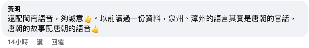有岛内网友就默示,“闽南语配音,够诚意!往时读过一份贵寓,泉州、漳州的言语其实是唐朝的官话,唐朝的故事配唐朝的语音!”