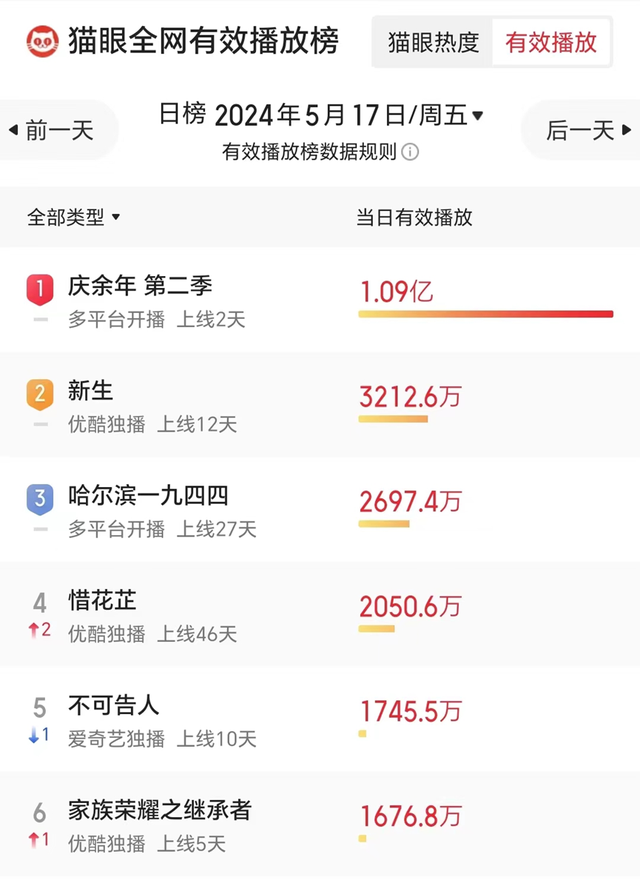 笔据猫眼专科版数据,《庆余年2》各项播映数据近期“断层”最初。笔据灯塔专科版数据,《庆余年2》开播于今正片累计播放量稀奇2.63亿,最初于同时其他剧集。