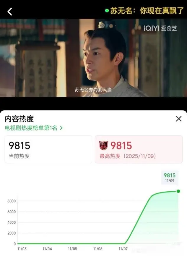 最进击的少量是,《唐朝诡事录3》播出之后的热度就一齐从8500飙到了9800,以致到咫尺还在不时进取飙升。