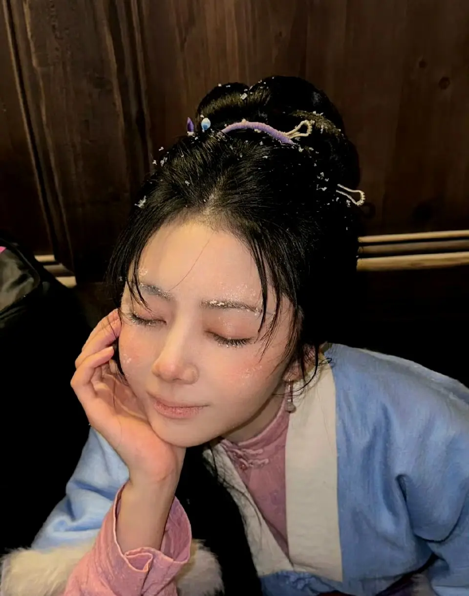 更让东谈主惊喜的是妆发团队的“避讳细节”:谭松韵的头发被处分得微湿,发梢还沾着渺小的“雪花颗粒”(其实是特制的泡沫谈具),衣服领口和袖口故意作念了“结霜”成果,连手指枢纽皆涂了浅浅的紫色,模拟冻僵后的情状。网友看完细节图直呼:“妆发真诚是显微镜级别的细密吧!”“这妆发比真冻伤还真,我差点就去批驳区喊‘快给妹妹穿衣服’了!”