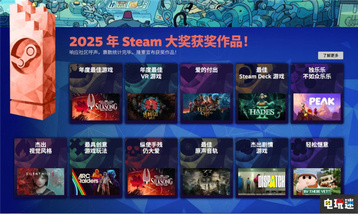 跟着2026年的到来,Steam也厚爱公开了2025年Steam游戏大奖的获奖名单。让系列粉丝翘首以盼许久的星河城游戏《空匮骑士:丝之歌》夺得了2025年Steam“年度最好游戏大奖”,而2025年的奖项收割机《光与影:33号远征队》获取了“最好原声息轨奖”。“超过剧情奖”由《咱们身边的狼》修复团队的互动剧情新作《超英叮咛中心》夺得。《博德之门3》也在一众老敌手中脱颖而出获取“爱的付出奖”。在竞争最犀利的“独乐乐不如众乐乐奖”中,《Peak》也真的登顶。不外缺憾的是《天堂赈济2》本次Steam年度大奖依旧颗粒无收。