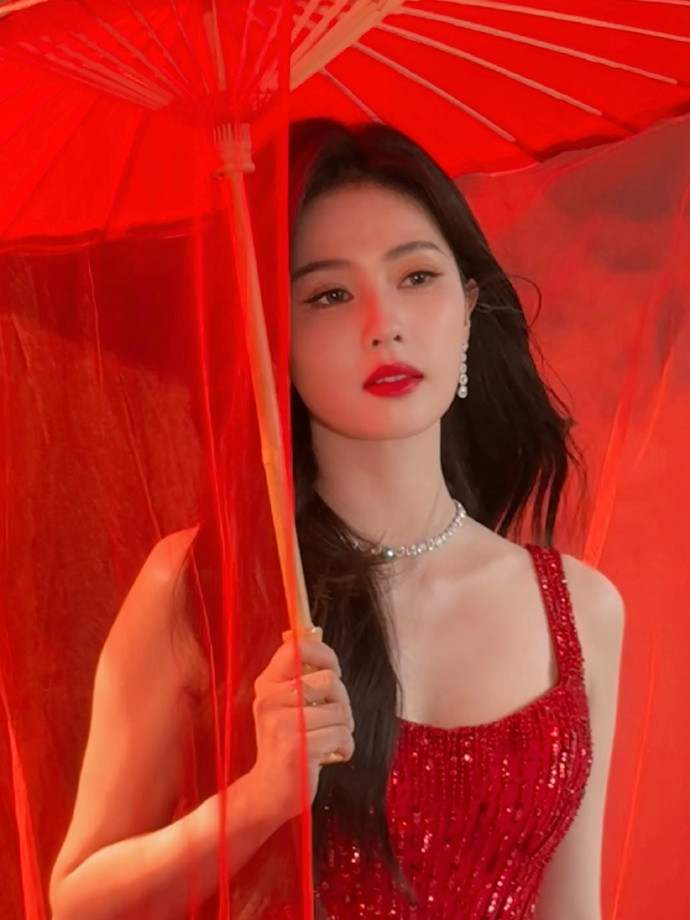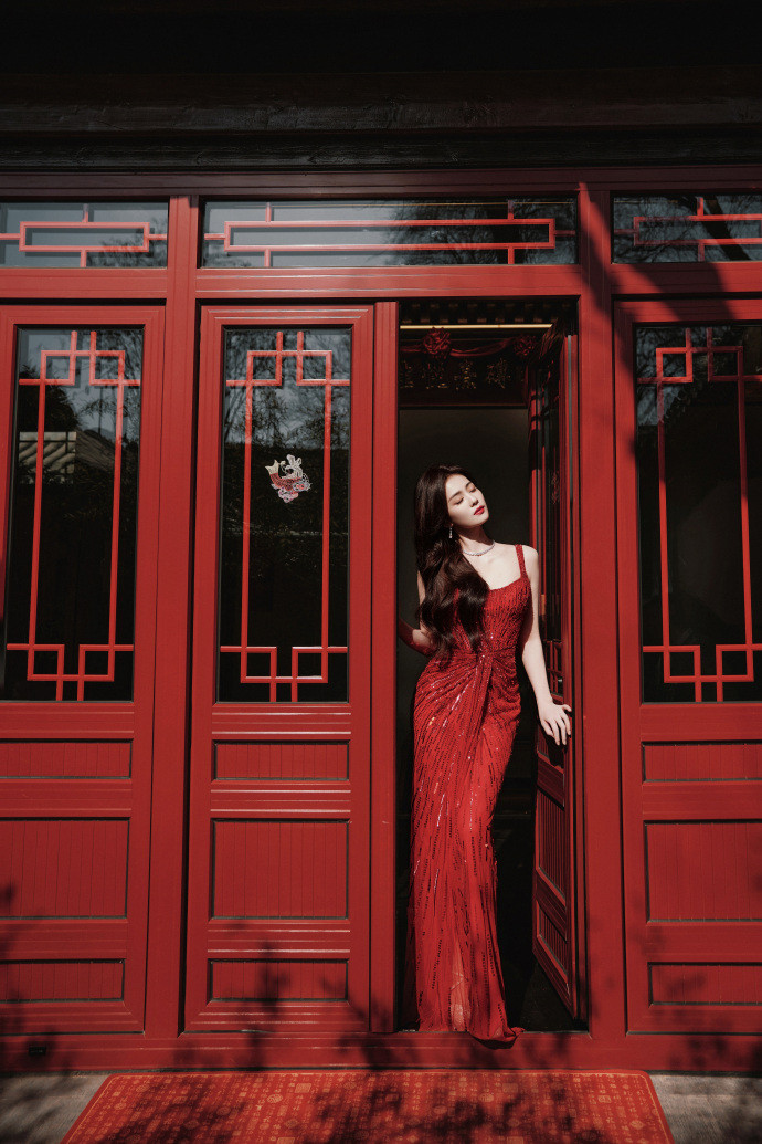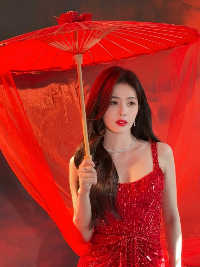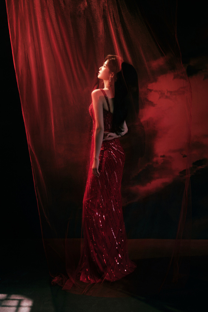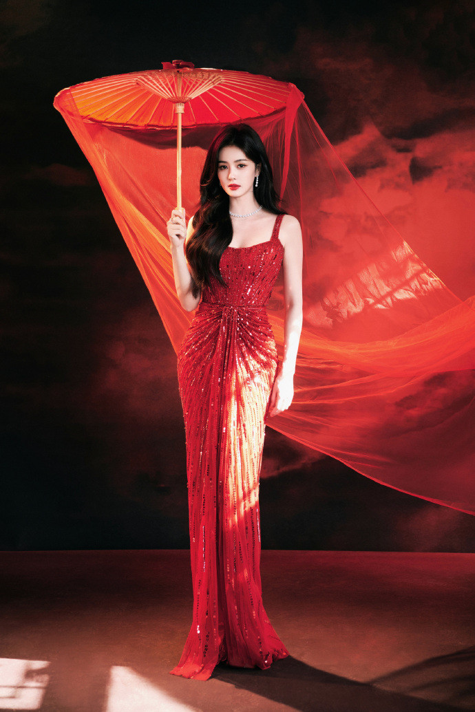 这组造型跳出老例红装的安祥感,用灵动的红纱与耀眼亮片,