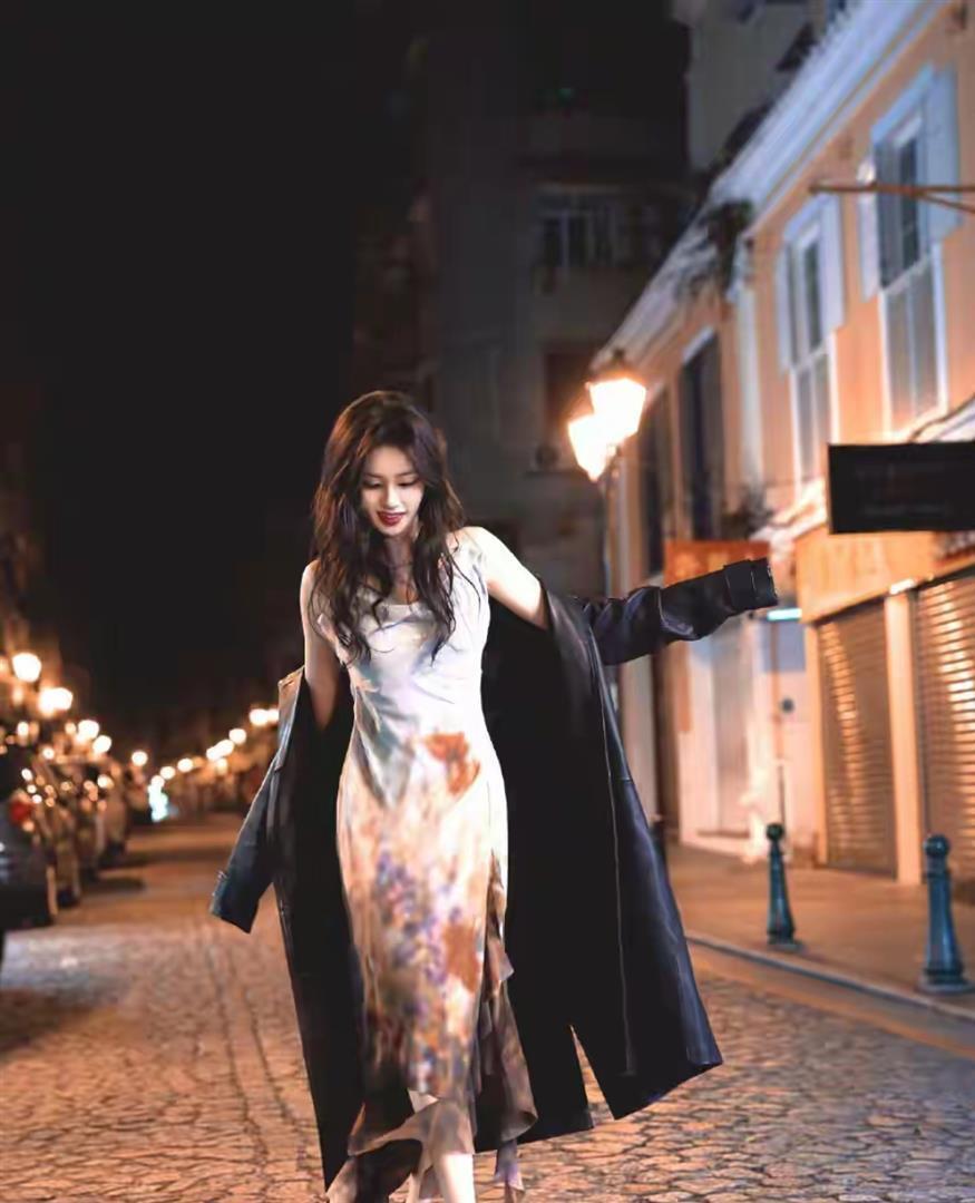 白鹿澳门街头杀疯了! 皮大衣配印花吊带裙,又酷又媚成功封神