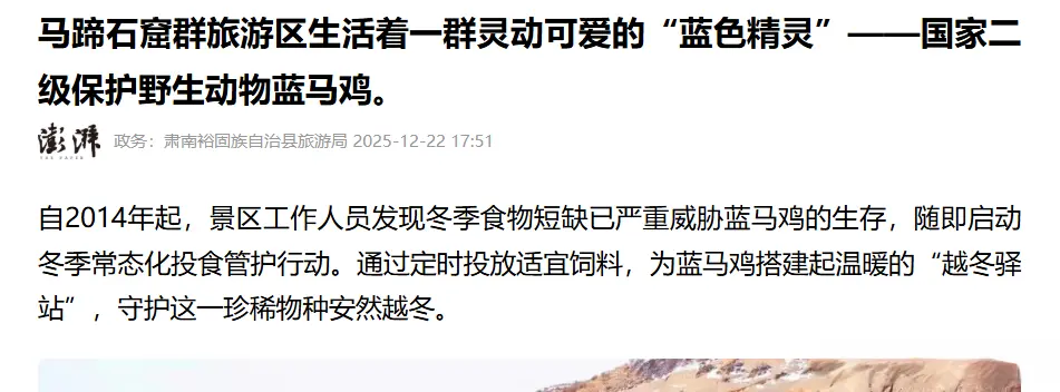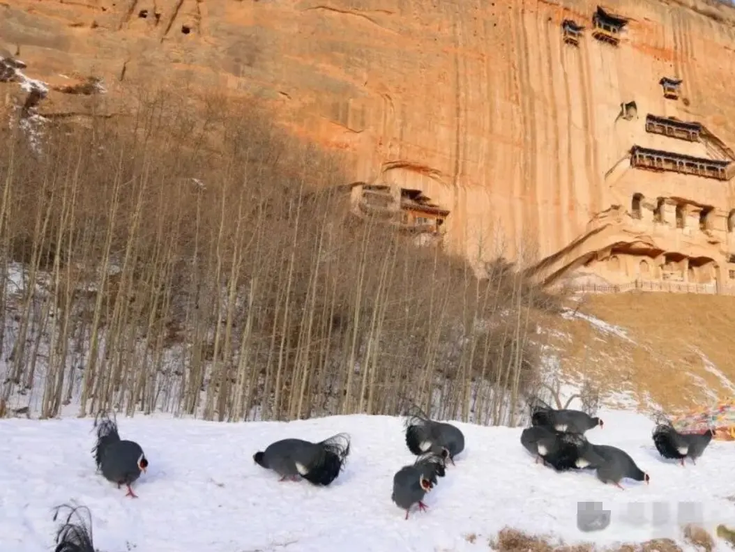 在甘肃省张掖市马蹄寺石窟群相近,当地保护机构与景区、社区协作,在食品异常匮乏的冬季投喂蓝马鸡、严格法规东谈主为干扰。