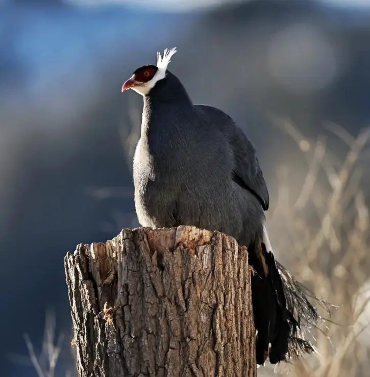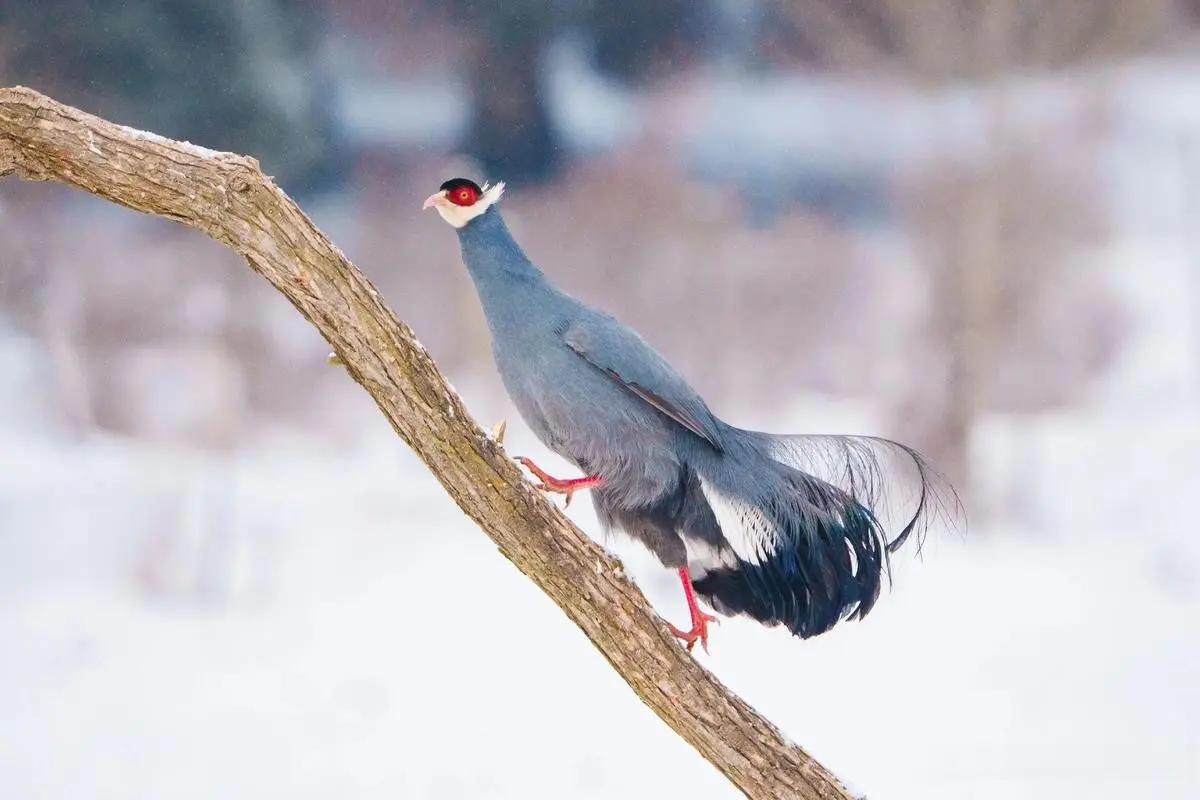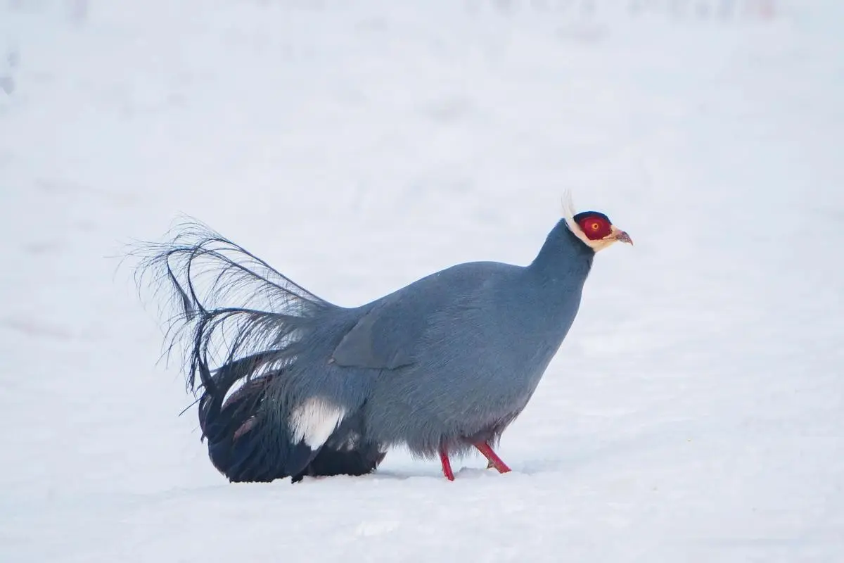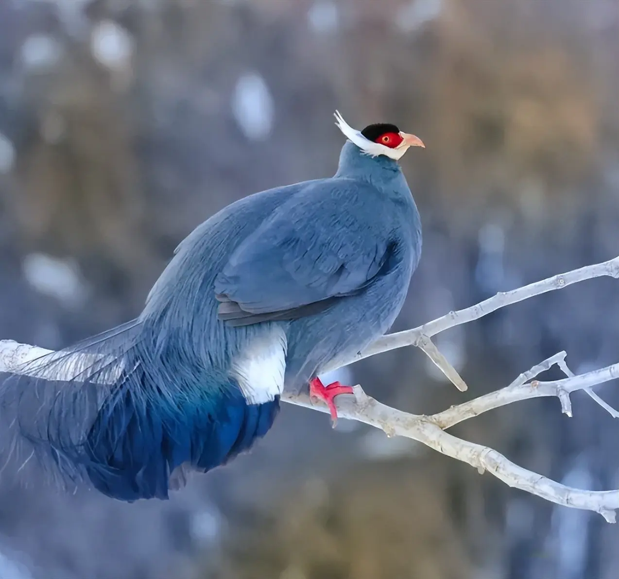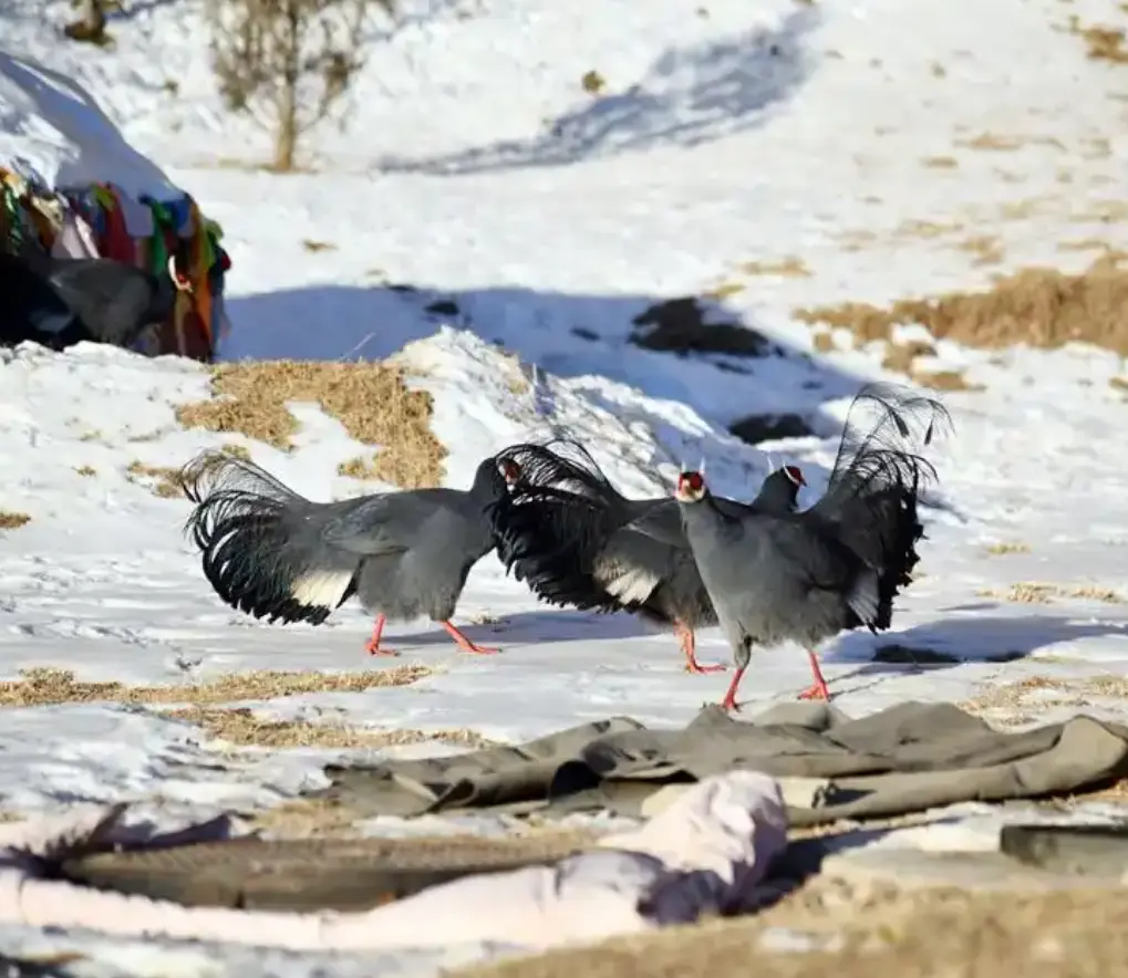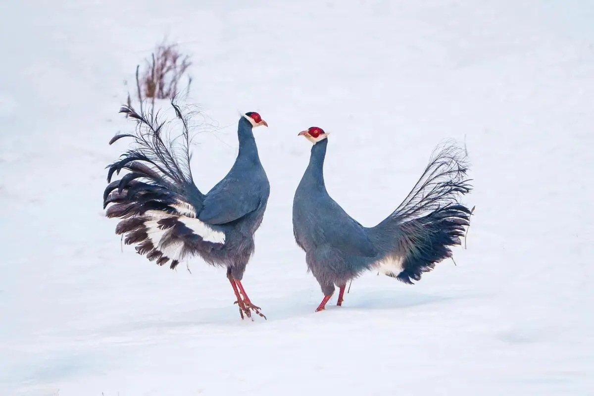 它们长了一身蓝色的羽毛,尾巴绝顶蓬松,猛地一看也有点像孔雀,而脑袋和腿却是红色的,在雪地里绝顶显眼。