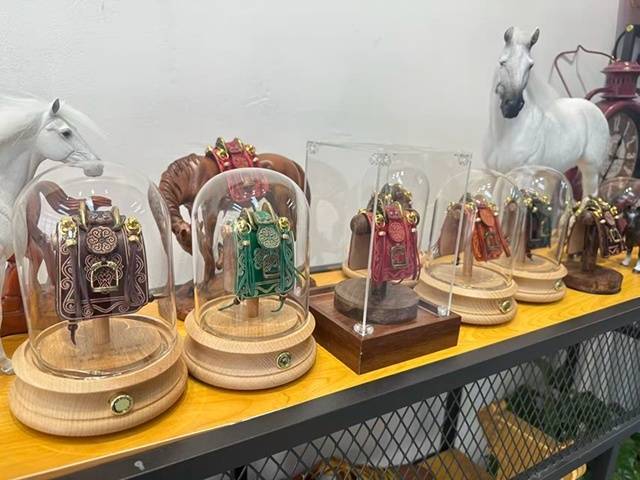 马年主题皮雕挂件、雕花马鞍。韩云玲摄