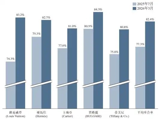 与此同期,老铺的线上平台收入占比栽种至17.1%,其品牌影响力正快速浸透至一线及新一线除外的花消东说念主群。截止2025年12月31日,老铺黄金会员达61万名,同比增长74.3%。弗若斯特沙利文调研贵府泄漏,老铺黄金花消者与路易威登、爱马仕、卡地亚、宝格丽等国际五大北坏牌的花消者平均重合率从2025年7月的77.3%栽种至2026年3月的82.4%。财报原文指出,“老铺黄金花消者与国际败坏牌东说念主群高度重合,具备高端花消特色,考证了品牌的高端定位。”