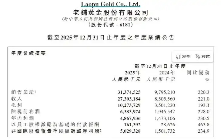 蓝鲸新闻3月23日讯(记者 汤诗韵)黄金一派大跌声中,老铺黄金发布了2025年度功绩阐述。财报泄漏,老铺黄金期内收入273.03亿元东说念主民币手机押大小赌钱的软件,同比增长221.0%;母公司通盘者应占盈利为48.68亿元,同比增长230.5%;毛利增长193.4%至约102.74亿元。